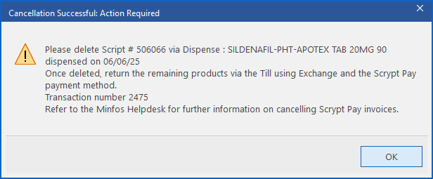 Once cancelled via Scrypt Pay, the sale must be manually voided or cancelled in Minfos.