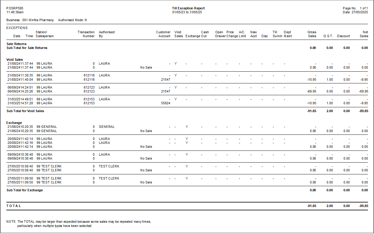 In the example below the exceptions & transactions selected were Sales Returns, Exchanges and Void Sales.