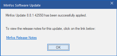 When you update your Minfos software, a prompt will display when the first terminal is logged into after the update to inform you that the update was successful.The Release Notes for this software are easily accessible from the prompt by clicking the link.
