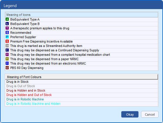 Tip: Right click anywhere on the window to display a legend containing the description of icons and font colour used in the drug recall window.