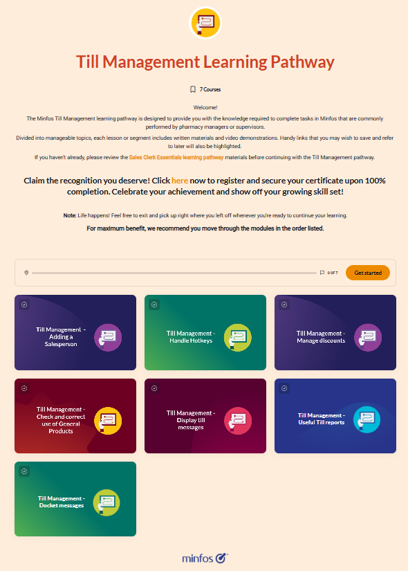 The Minfos Till Management learning pathway is designed to provide you with the knowledge required to complete tasks in Minfos that are commonly performed by pharmacy managers or supervisors.