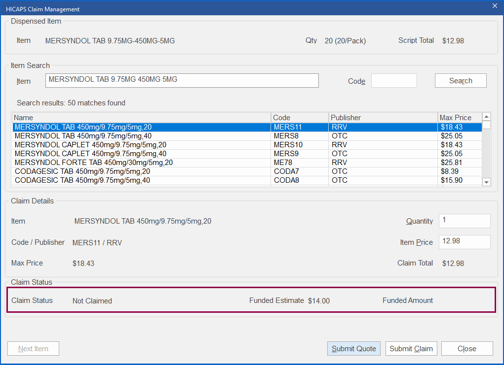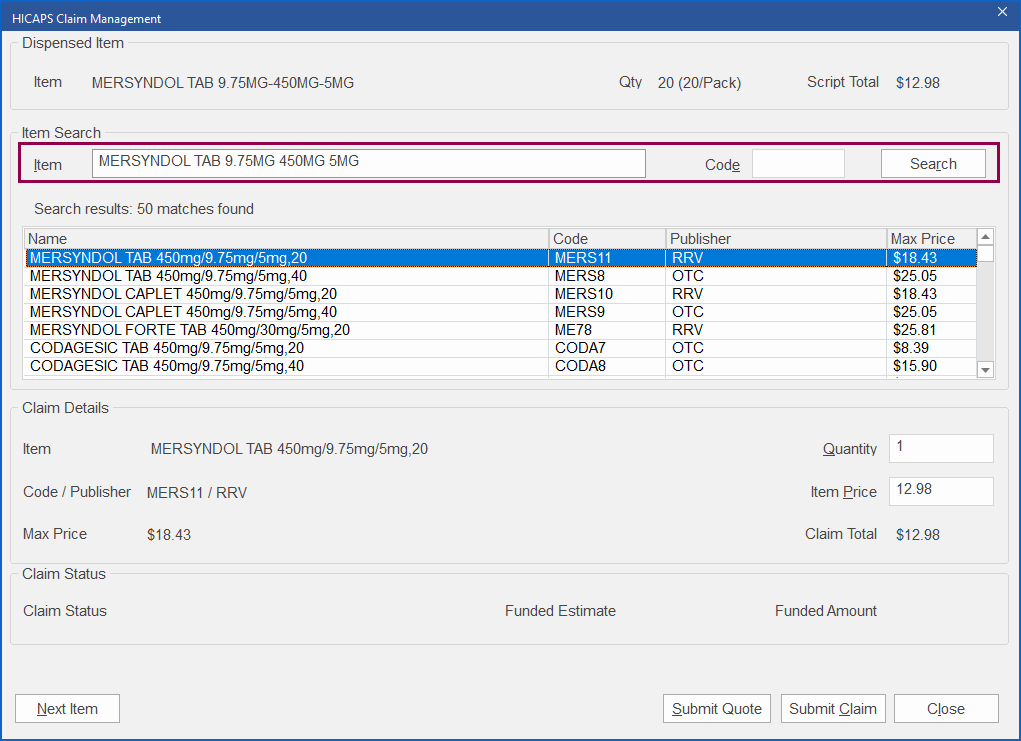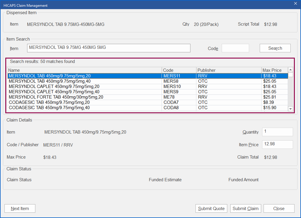 Minfos will automatically conduct a search for the first script selected and display any matching results in the HICAPS Claim Management window.