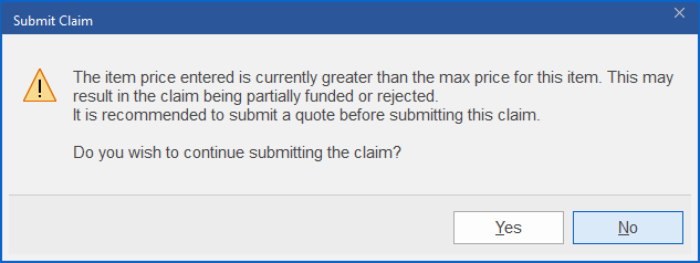 Note: If the Item Price is greater than the Max Price the Submit Claim prompt is displayed.