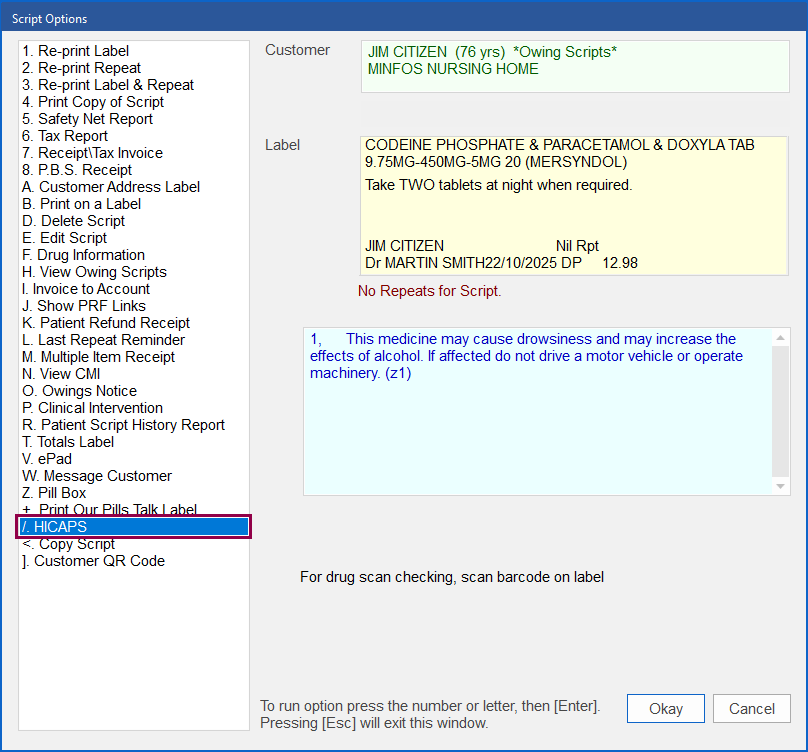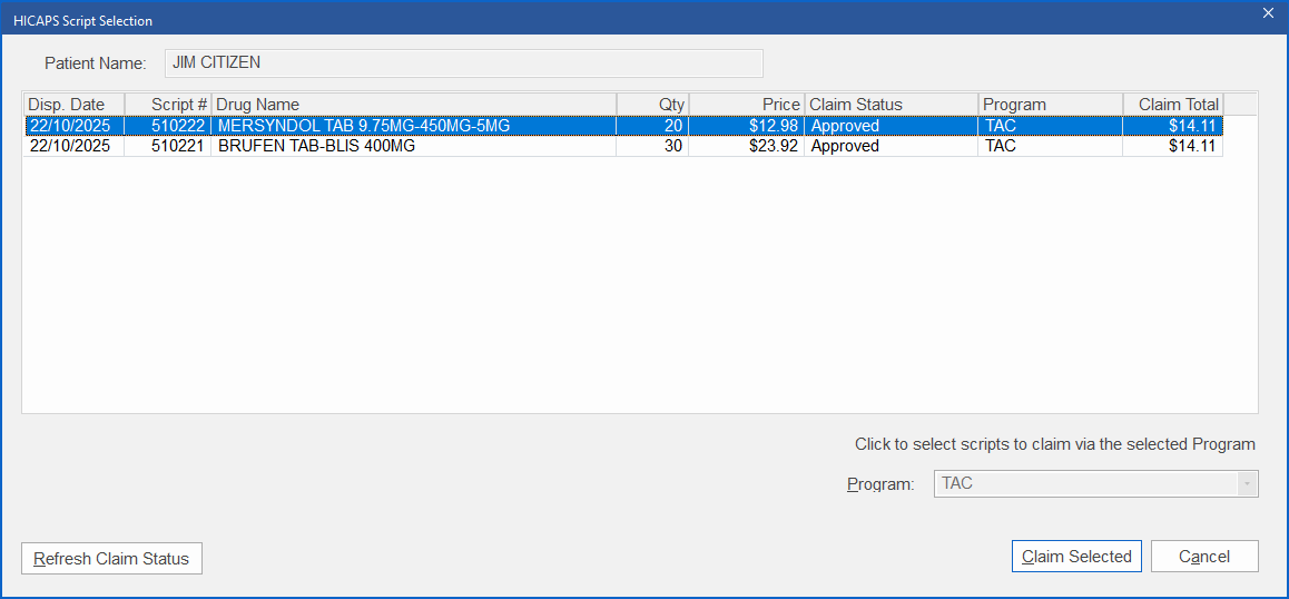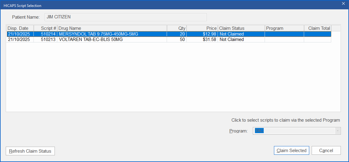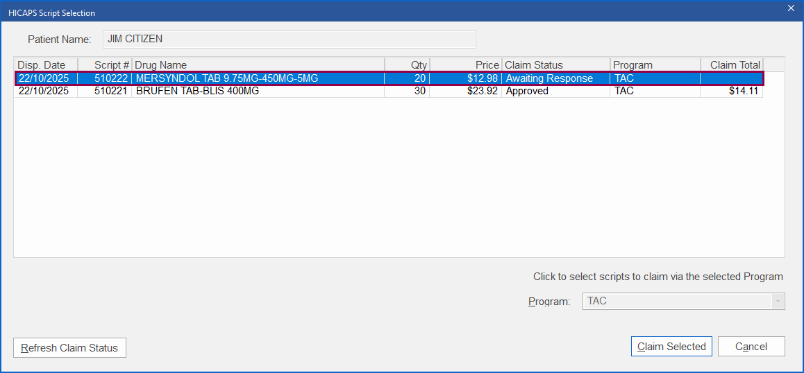 Once a script has been dispensed to a patient set up for HICAPS in Minfos it can be claimed with HICAPS.