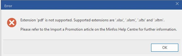 | The selected file is not a valid Excel promotion file. The converter only supports the official Minfos Excel promotion template saved as a .xlsx/.xlsm/.xltx/.xltm file. | - Close the message.