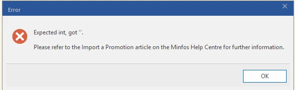 Expected int, got ''  | A field that must contain a whole number (integer) is blank or contains invalid text. Common examples include numeric flags (IsLoyalty, MultipleRedemptions, IsDiscountable) or discount/quantity fields. | - Note which field and row the error refers to if shown in the message or error listing.