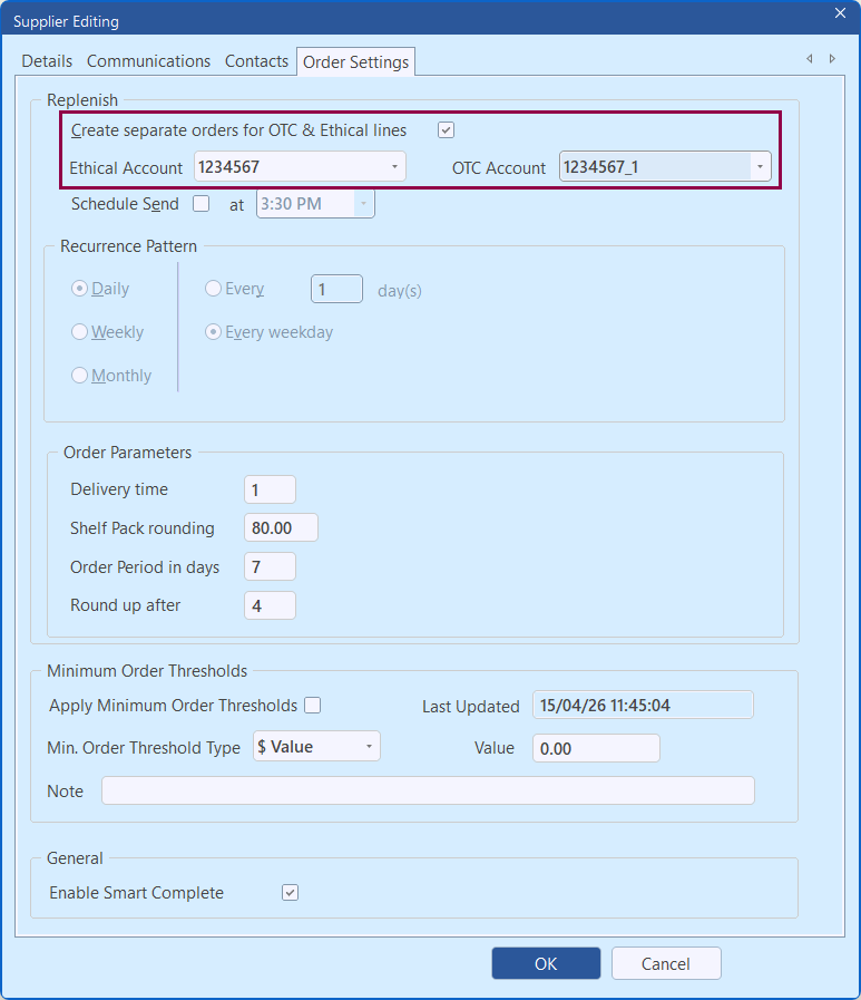 You can now assign separate supplier accounts for a single supplier to support Ethical and OTC ordering in Replenish (where you have more than one active account for the supplier). This is especially useful for pharmacies that manage different trading terms, credit limits, or delivery schedules depending on the product type.
