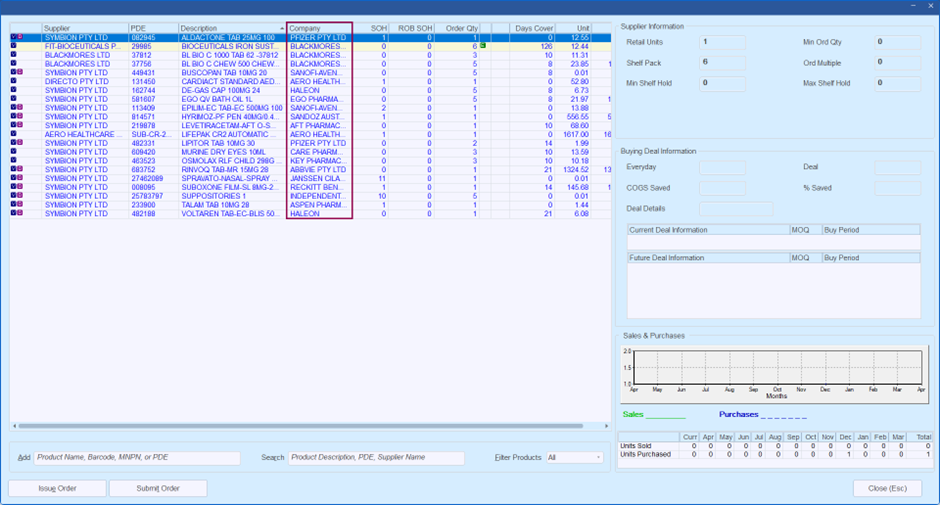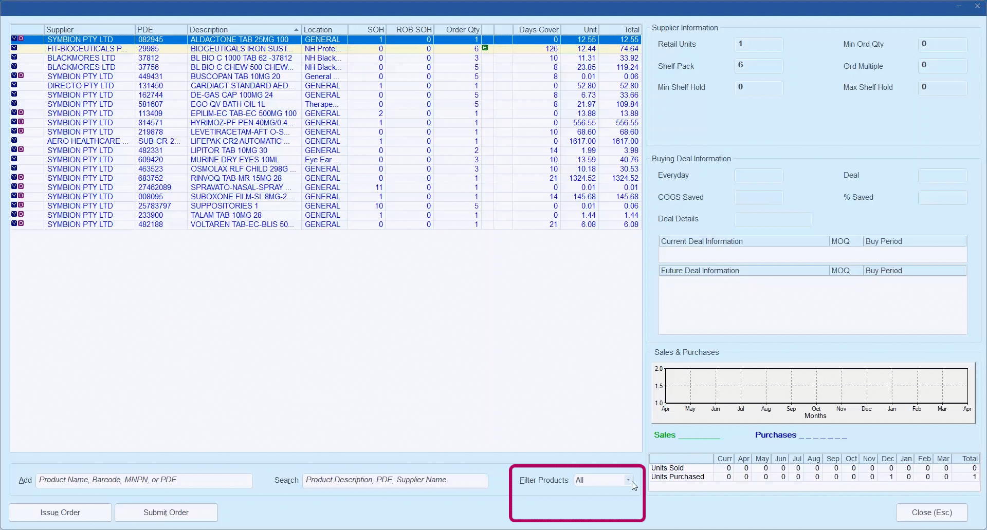 When you issue or submit an order the products in the filtered view will be included in the order. For example, If you had Filter Products set to OTC, all OTC products for the selected supplier will be included in the order.